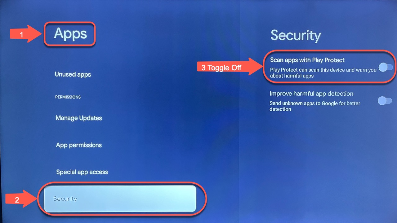 1.) Turn off Google Play Protect. Go to Settings > Apps > Security, then over to "Scan apps with Play Protect" and toggle that button OFF. (This step is very important because Google will remove the apps off your device if you don't do this step.)