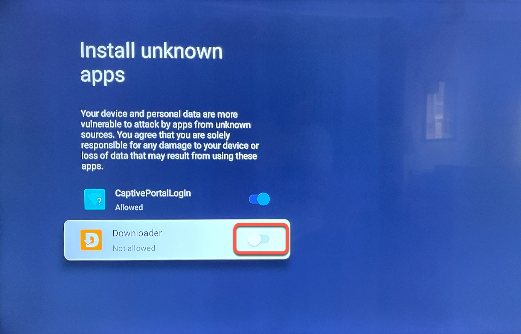 4.) Click on Settings then Toggle On Downloader to allow "installation of unknown apps."