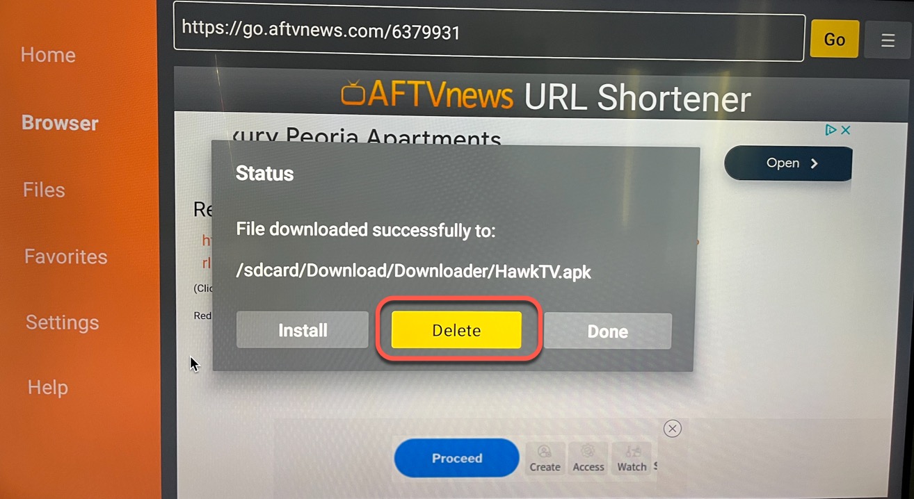 8.) In Downloader, click on Delete, then Delete again to confirm you want to delete the download file. (Do this for every app you install...this will keep space available on your Hard Drive)