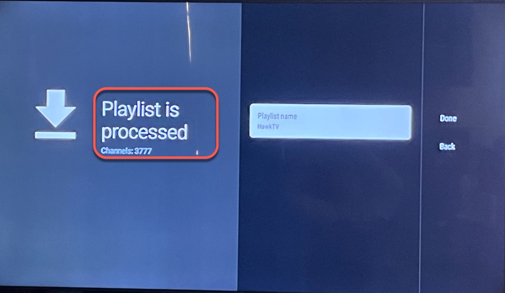 12.) This will start “Processing”, once it’s done you should see a message “Playlist is processed Channels: 3700+”. Click the Done button on the far right of the screen. (if you DO NOT see thousands of Channels processed DO NOT click Done. You have a typo in your username or password so click the back button and correct it first.)