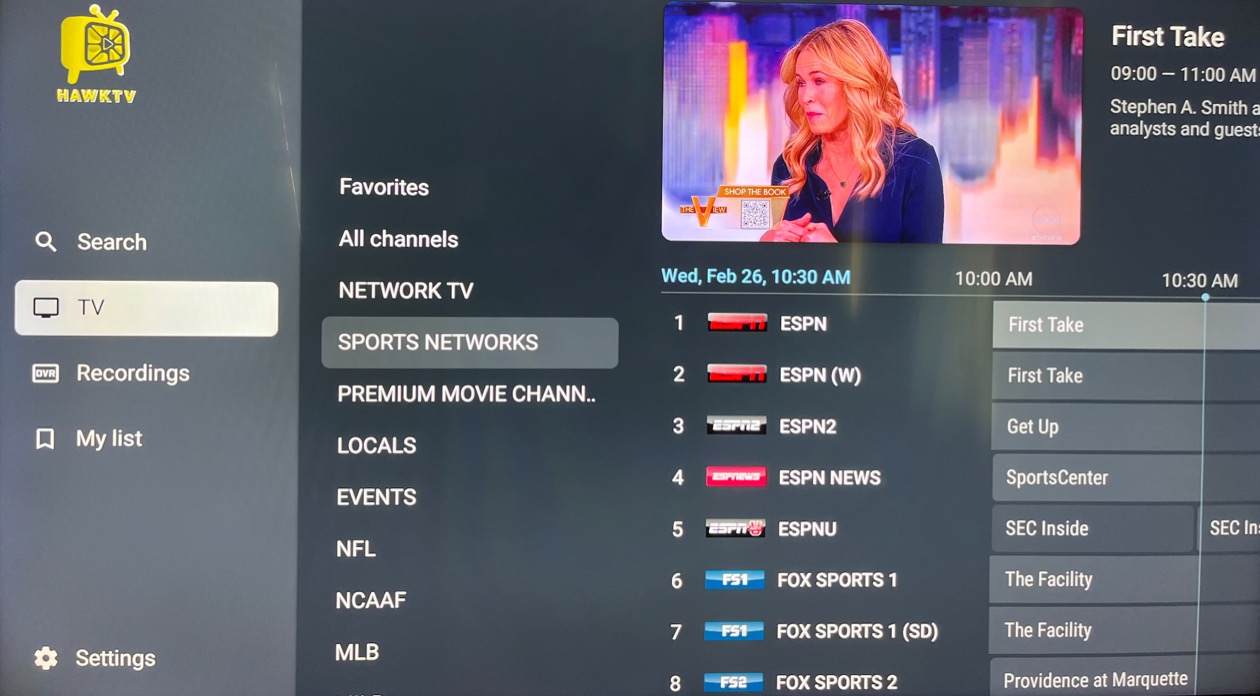 13.) This will lead you into the HawkTV guide. The channel listing guide will update after a few seconds where you’ll be able to see what’s playing on each channel. Click left on your remote to get into the different categories of channels. Long press the "OK" button on any channel to record, favorites, build groups, etc. You can click right on any channel to use as a "Previous Channel / Go Back" functionality.