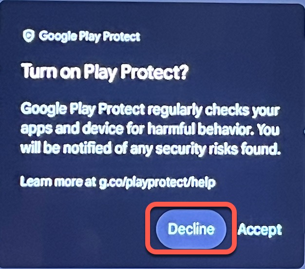 6.) Click Decline on the "Turn on Play Protect?" pop-up message.